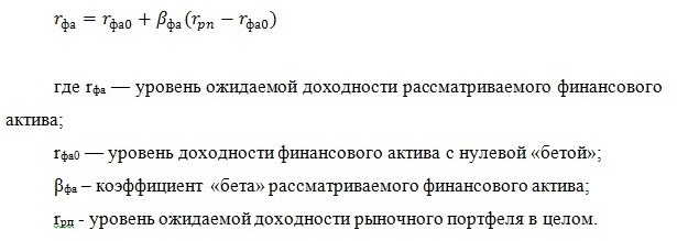 Блэк отказался от предположения о существовании безрискового актива, который инвестор может одалживать и брать в долг. При этом допущении в базовой модели были произведены некоторые изменения, хотя ее общий вид остался прежним. Суть изменений состоит в возможности формирования портфеля с нулевой «бетой», т.е. портфеля, не коррелирующего с рыночным. Полученная модель называется двухфакторной и не отличается от классической CAMP за исключением замены безрисковой процентной ставки ожидаемой доходностью портфеля с нулевой «бетой».