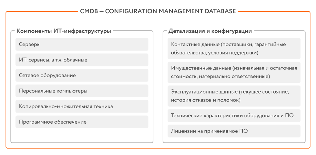 База данных управления конфигурацией (CMDB) — это централизованная база данных, в которой хранятся данные о серверах, программном обеспечении, сетевых устройствах и других элементах IT-инфраструктуры.